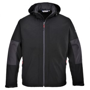 PW Softshell jakna SA KAPULJAČOM I OJAČANJIMA materijal troslojni laminirani „Softshell” 96% poliester, 4% elastan. Vodonepropusni šavovi. Zatvaranje na patentni zatvarač s preklopom protiv hladnoće. Otvori rukava obrubljeni, postavljena polarnim flisom. DOSTUPNE BOJE: Crna-Siva(NA SLICI), Plava-Crna.